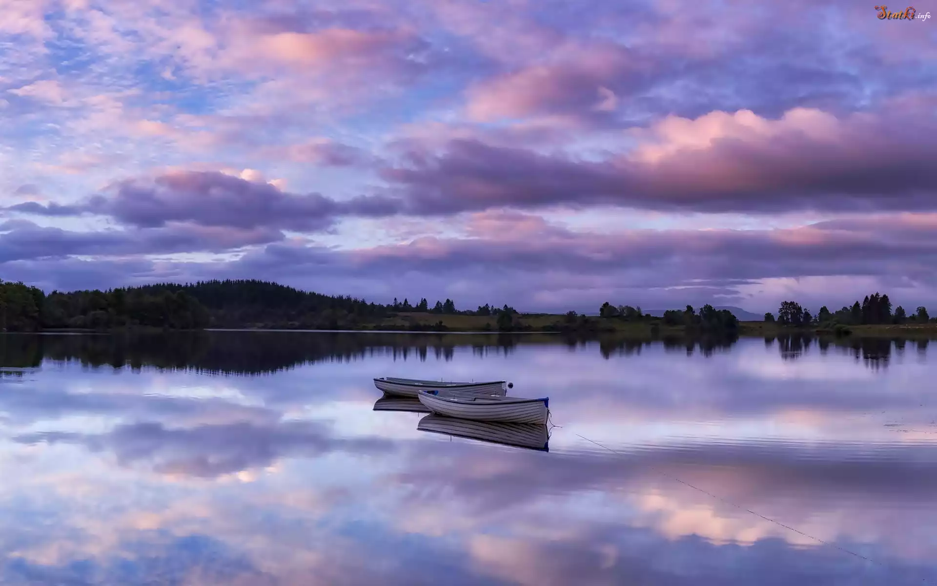 Jezioro, Łódki, Wzgórza, Chmury, Zmierzch
