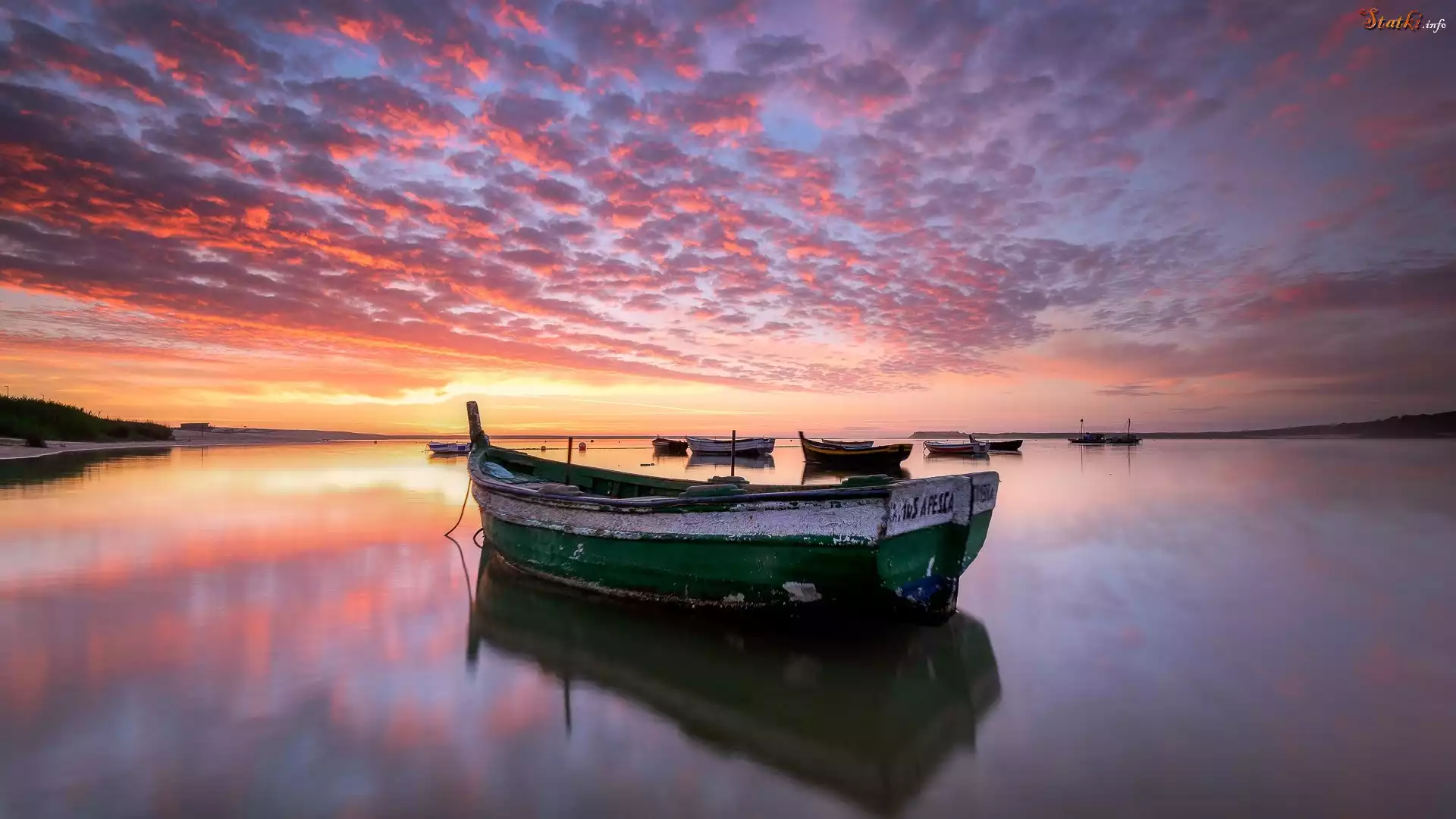 Statek Jezioro, Łódki, Zachód słońca, Chmury, Odbicie