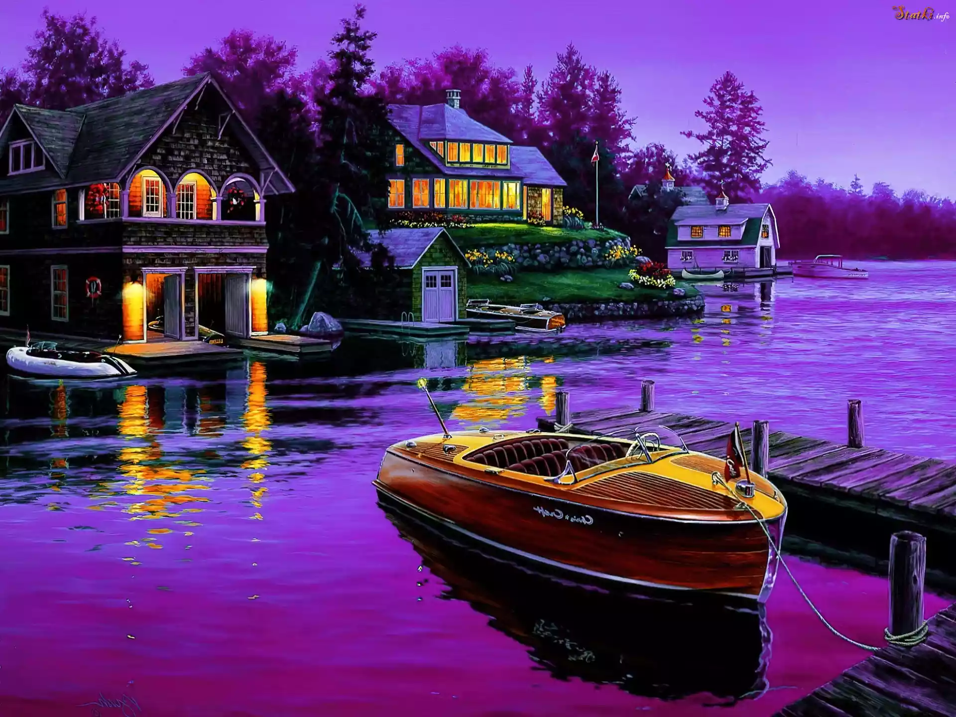 Jezioro, Motorówka, Domki, Obraz
