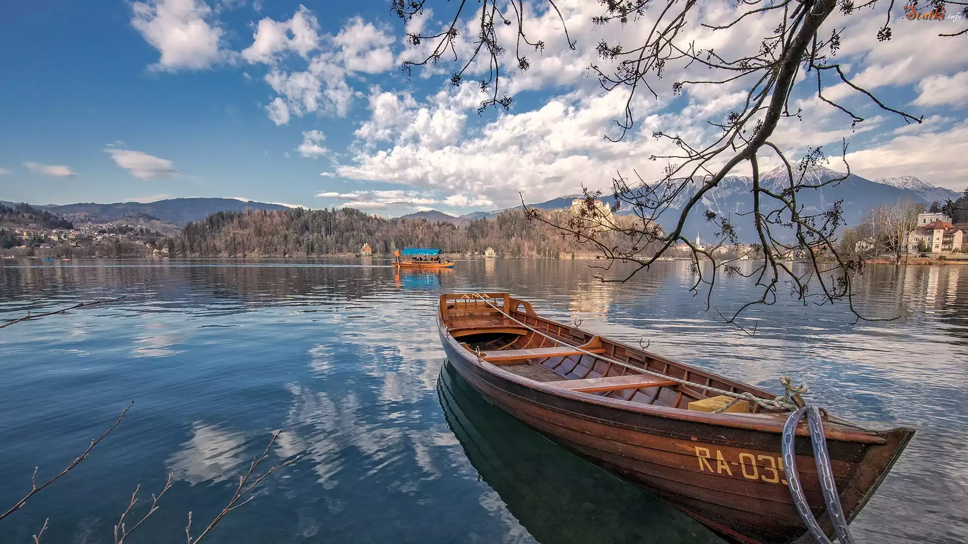 Statek Jezioro, Bled Lake, Łódka, Góry, Alpy Julijskie, Drzewa, Domy, Słowenia