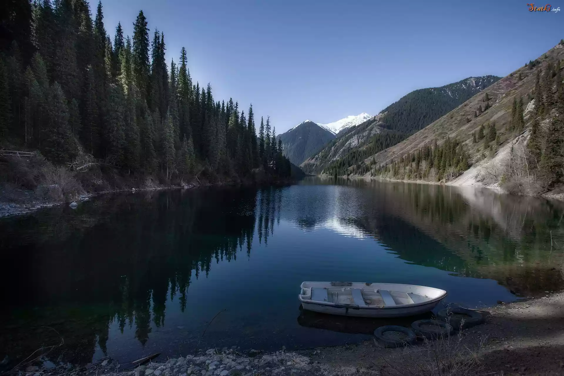 Jezioro Kolsay, Kazachstan, Łódka, Góry, Lasy