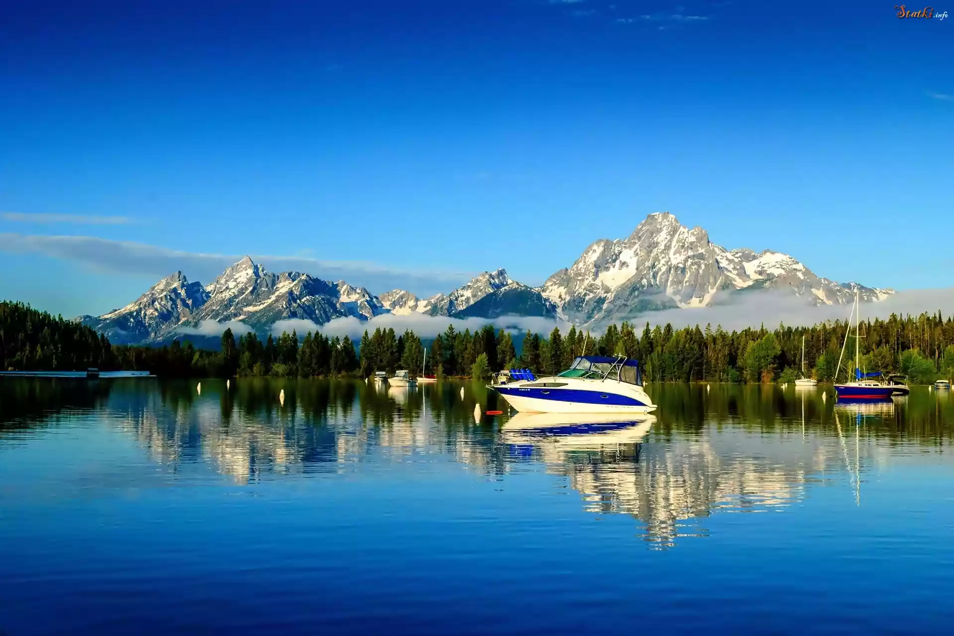 Statek Jezioro, Łodzie, Góry, Odbicie