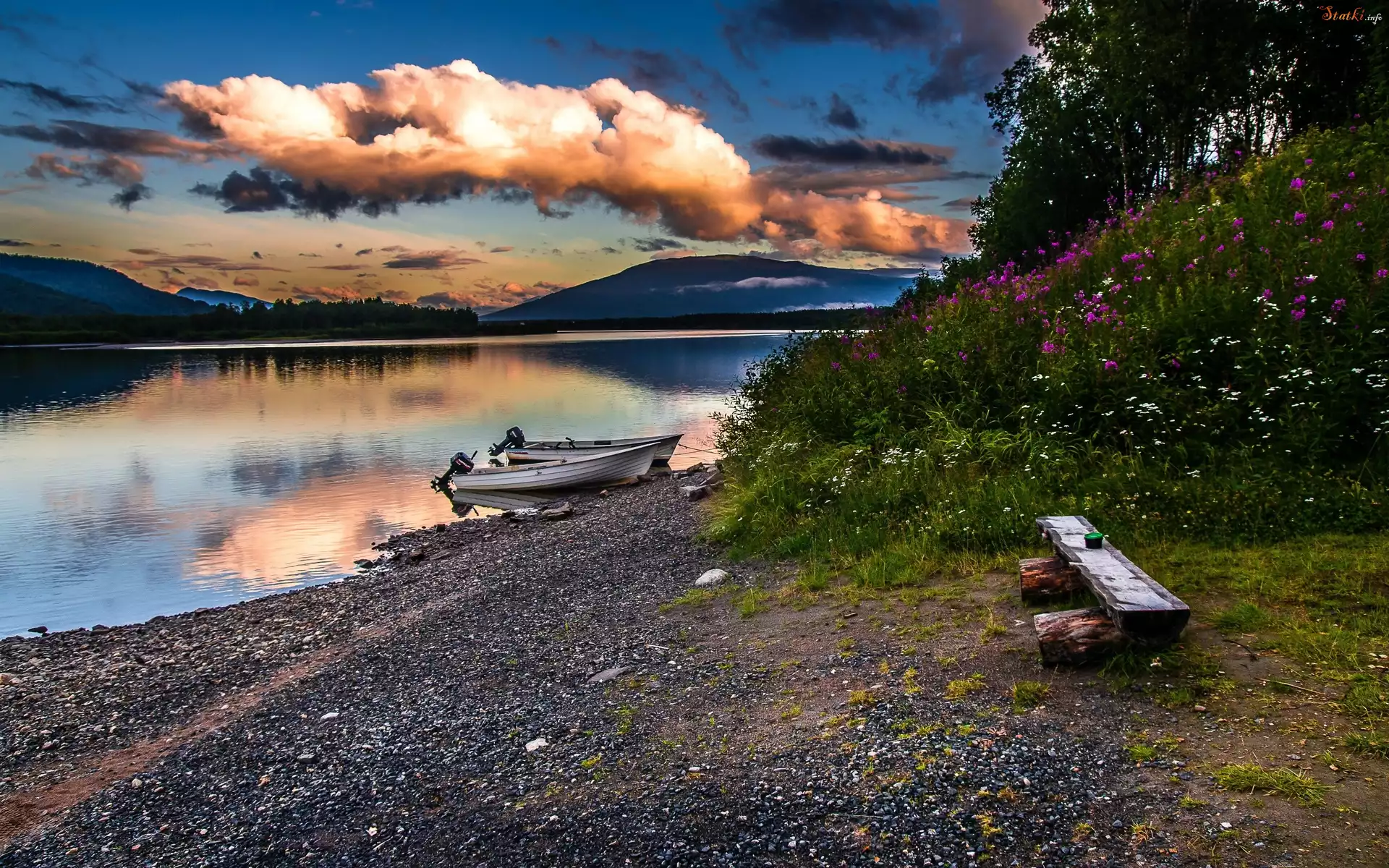 Jezioro, Łodzie, Góry, Kwiaty, Chmury
