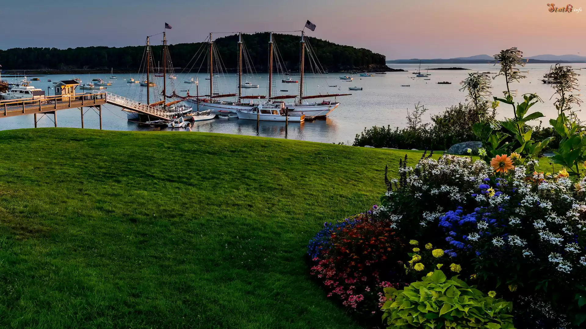 Przystań, Żaglówki, Jezioro, Rabatka, Kwiaty, Bar Harbor, Stan Maine, Stany Zjednoczone