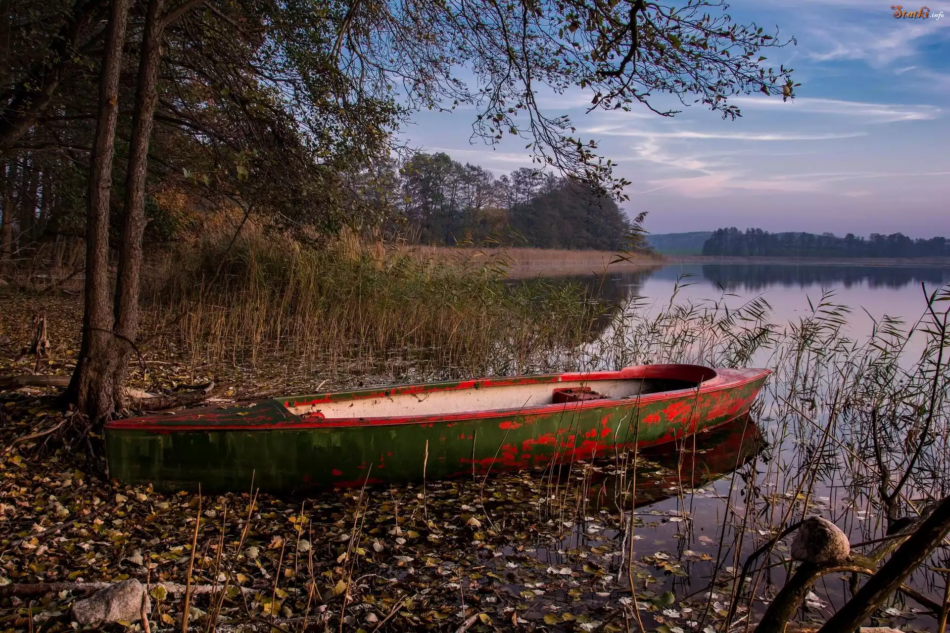 Statek Jezioro, Łódka, Trawy, Liście, Drzewa