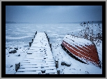 Zima, Jezioro, Łódka, Pomost, Niebo