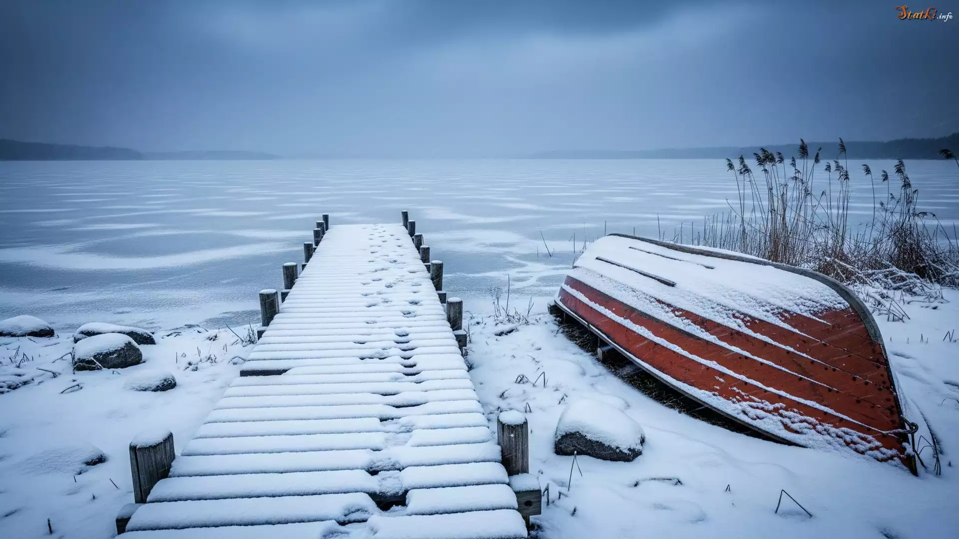 Statek Zima, Jezioro, Łódka, Pomost, Niebo