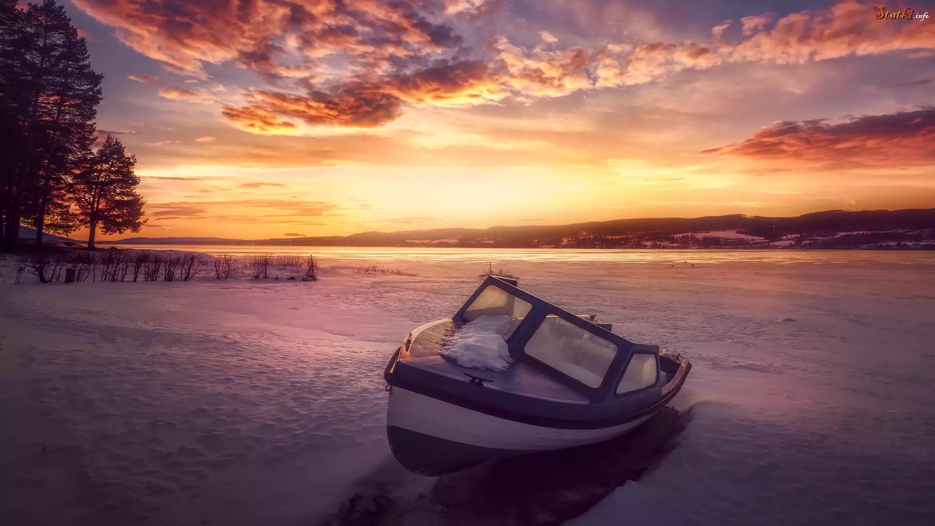 Statek Zima, Jezioro, Śnieg, Drzewa, Zachód słońca, Chmury, Motorówka