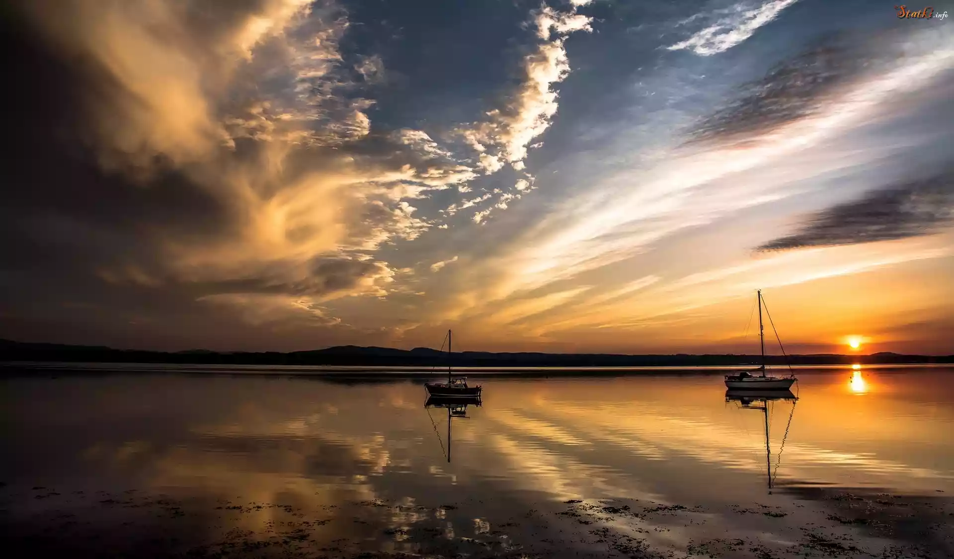 Statek Jezioro, Zachód słońca, Żaglówki, Odbicie, Chmury