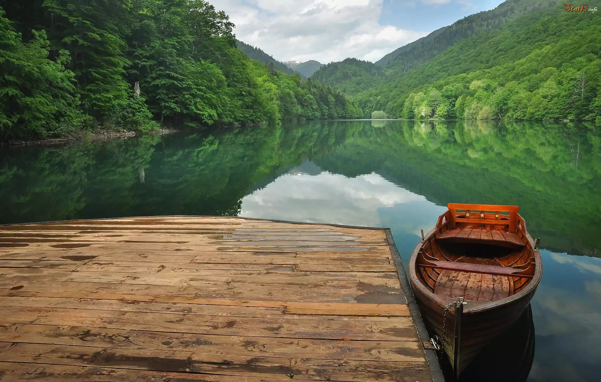Statek Jezioro, Góry, Lasy, Łódka, Pomost