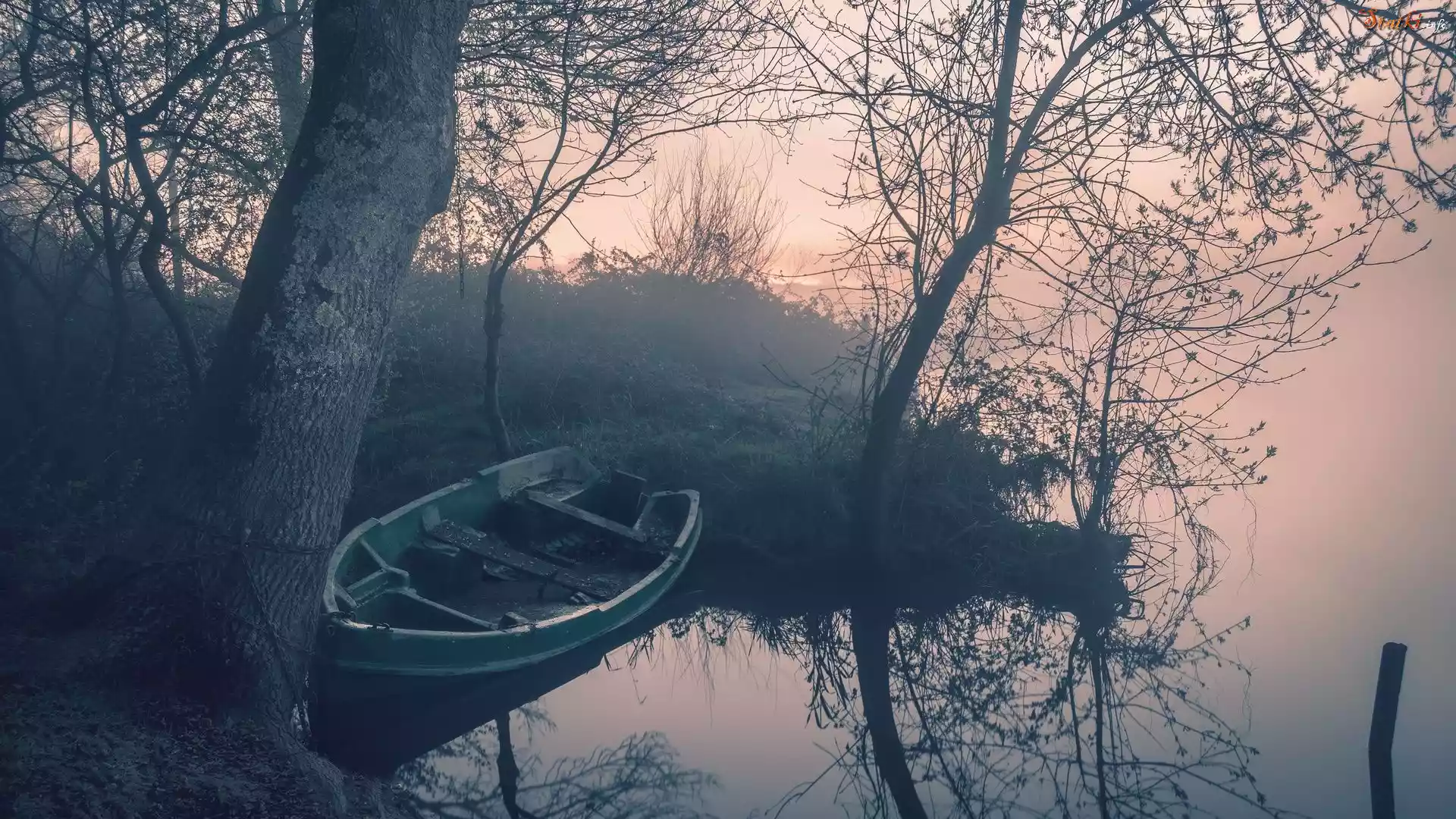 Statek Jezioro, Mgła, Łódka, Drzewa