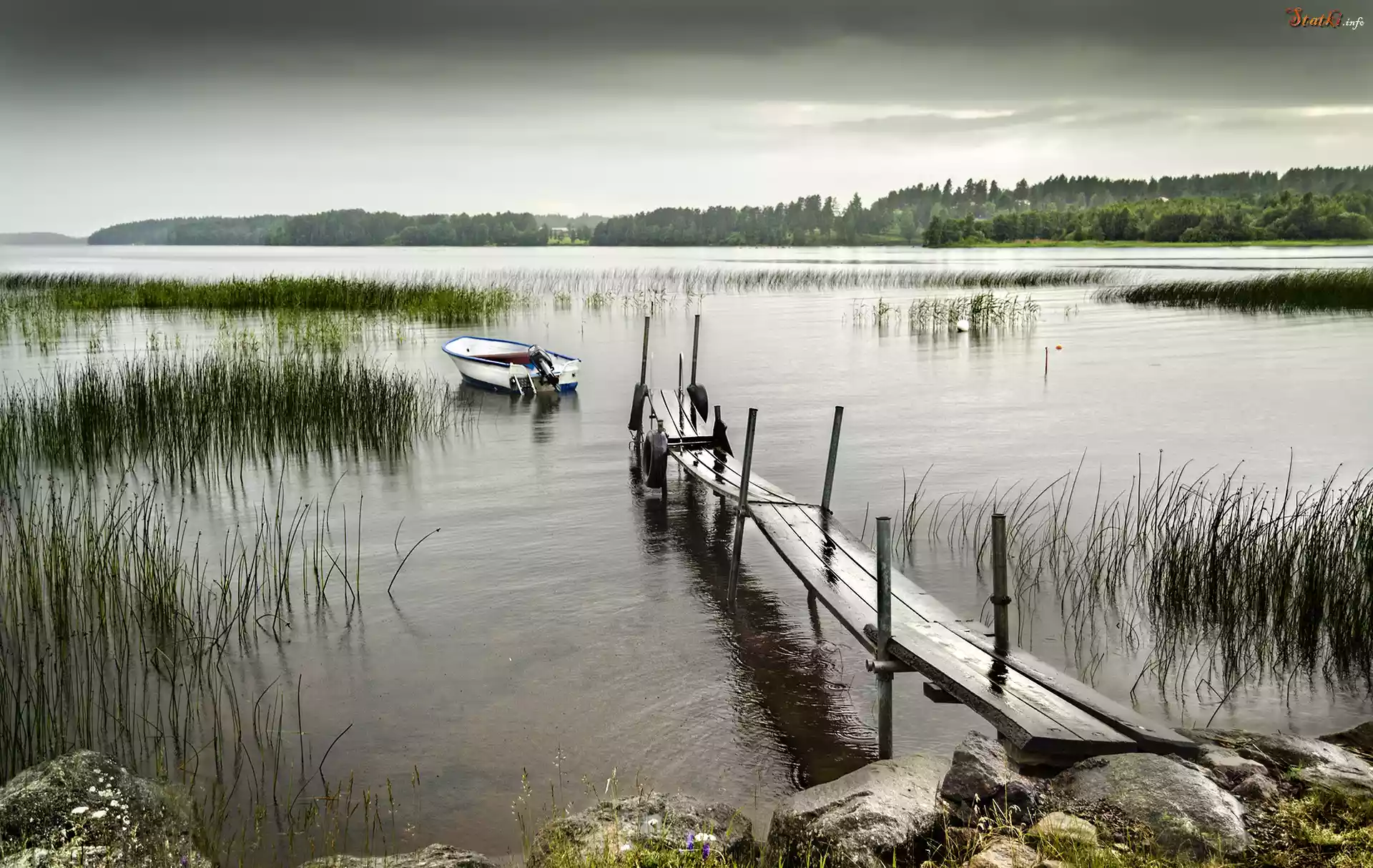Statek Jezioro, Pomost, Łódka, Trzciny