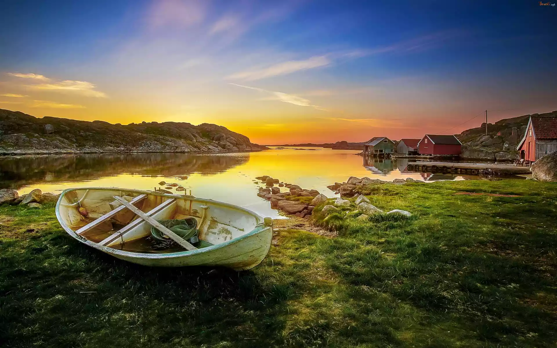 Statek Jezioro, Wschód, Słońca, Łódka, Domy