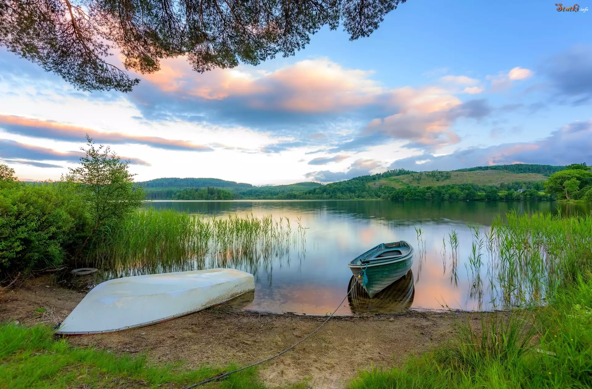 Jezioro, Drzewa, Trawy, Łódki, Brzeg