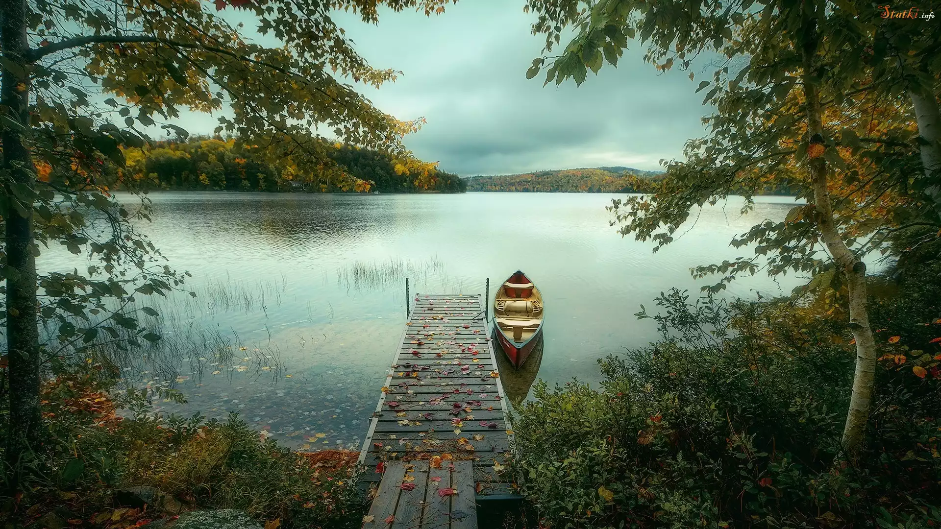 Statek Jesień, Jezioro, Pomost, Łódka, Drzewa