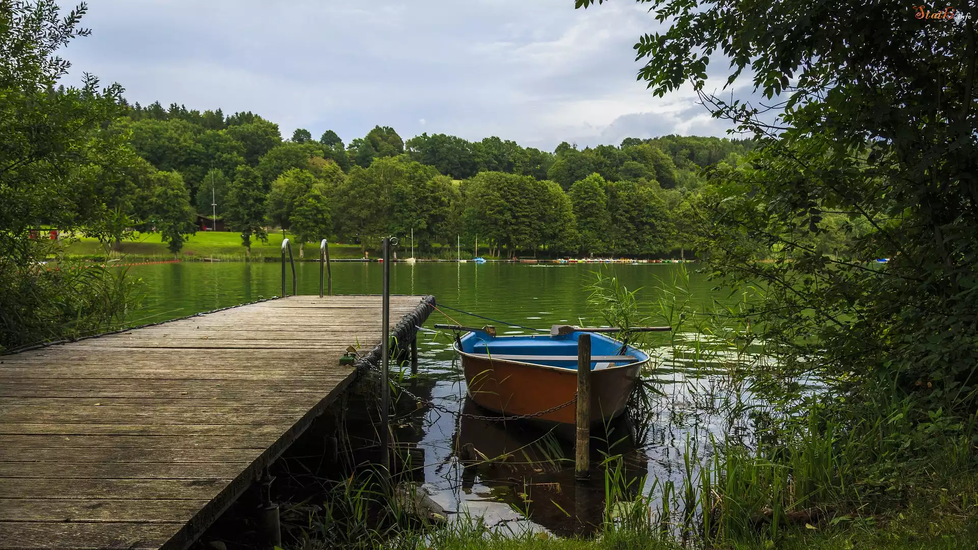 Statek Jezioro, Drzewa, Pomost, Łódka