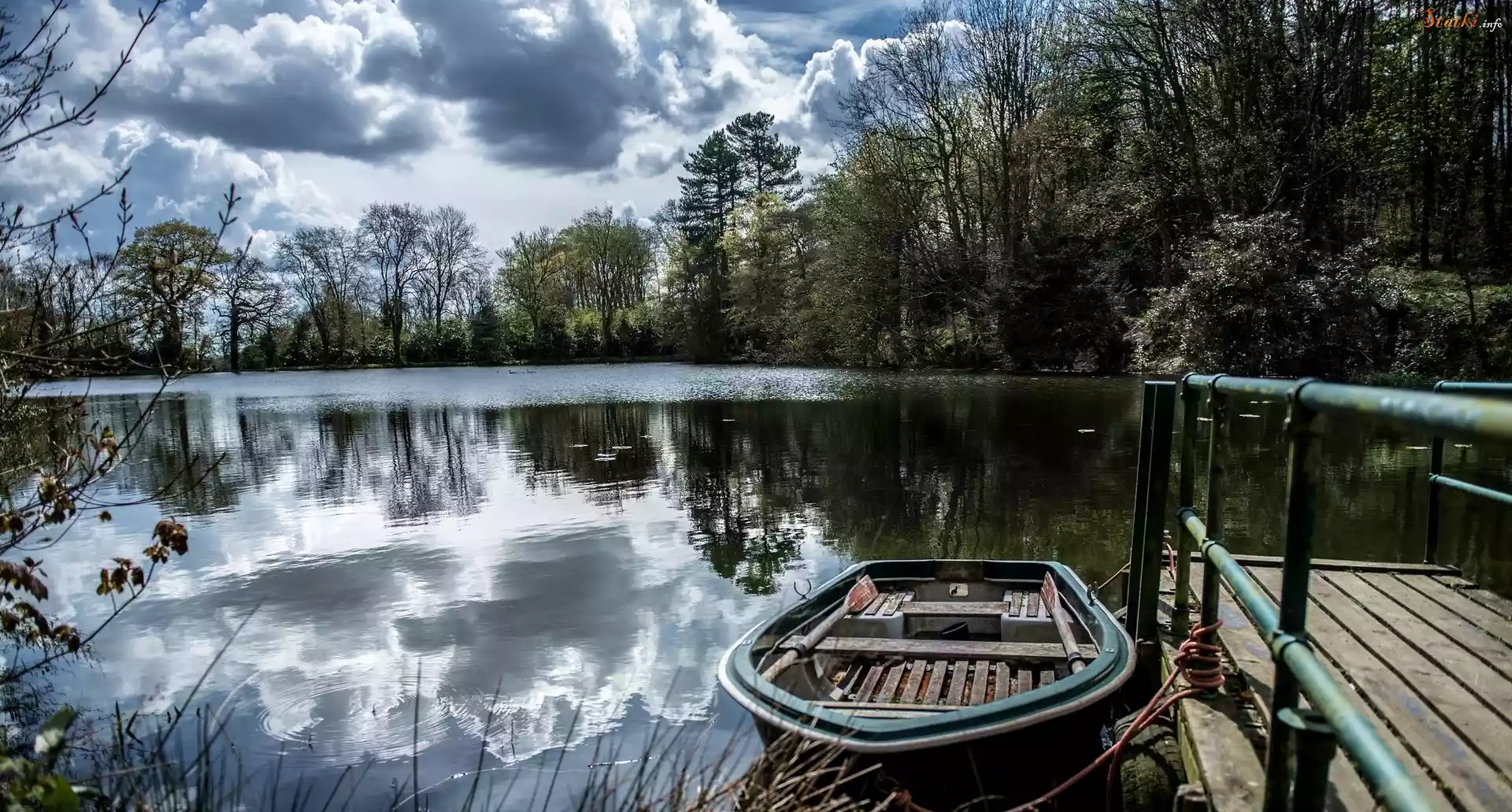Statek Jezioro, Drzewa, Łódka, Pomost, Odbicie