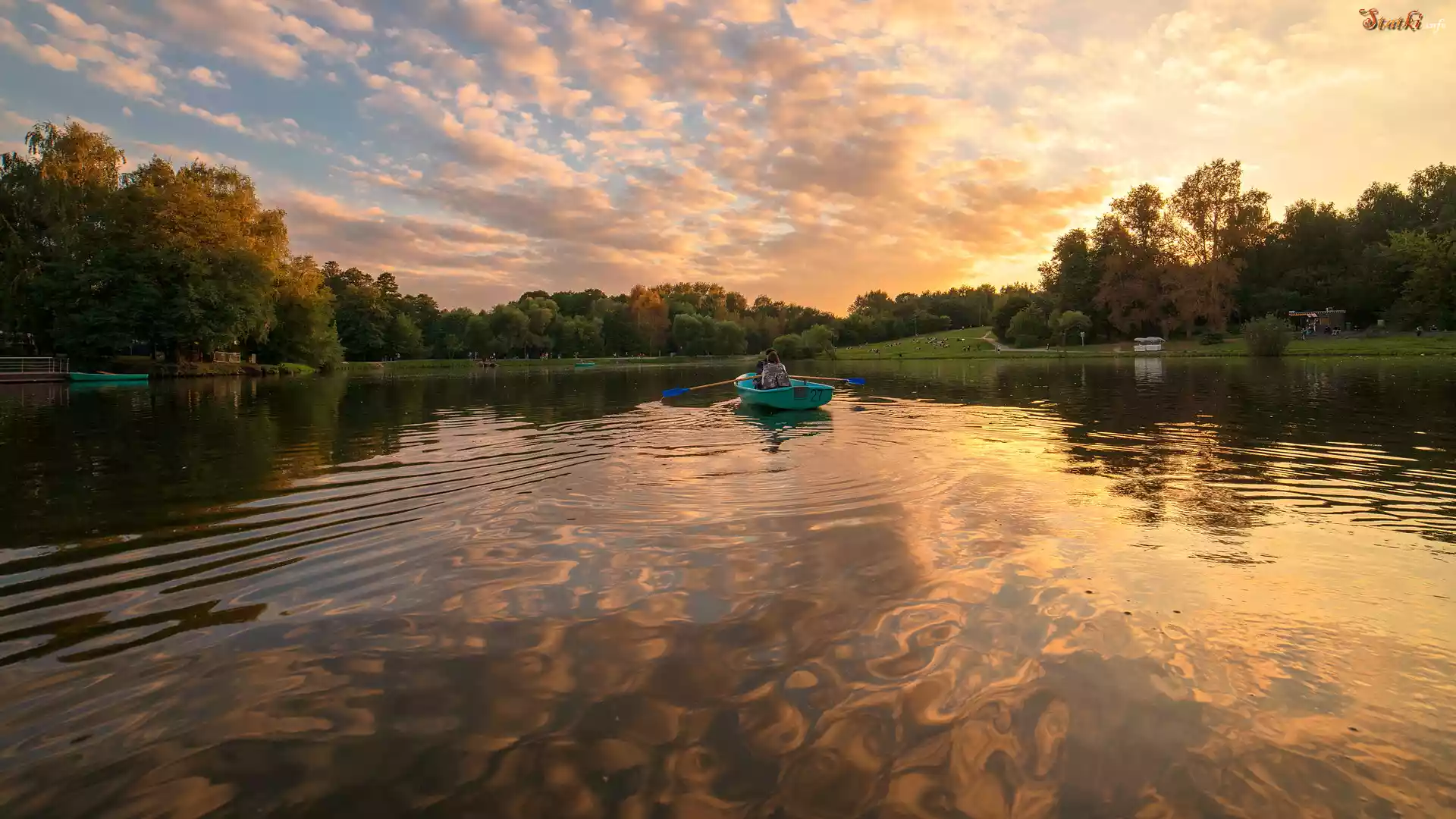 Statek Jezioro, Drzewa, Łódka, Zachód słońca, Chmury