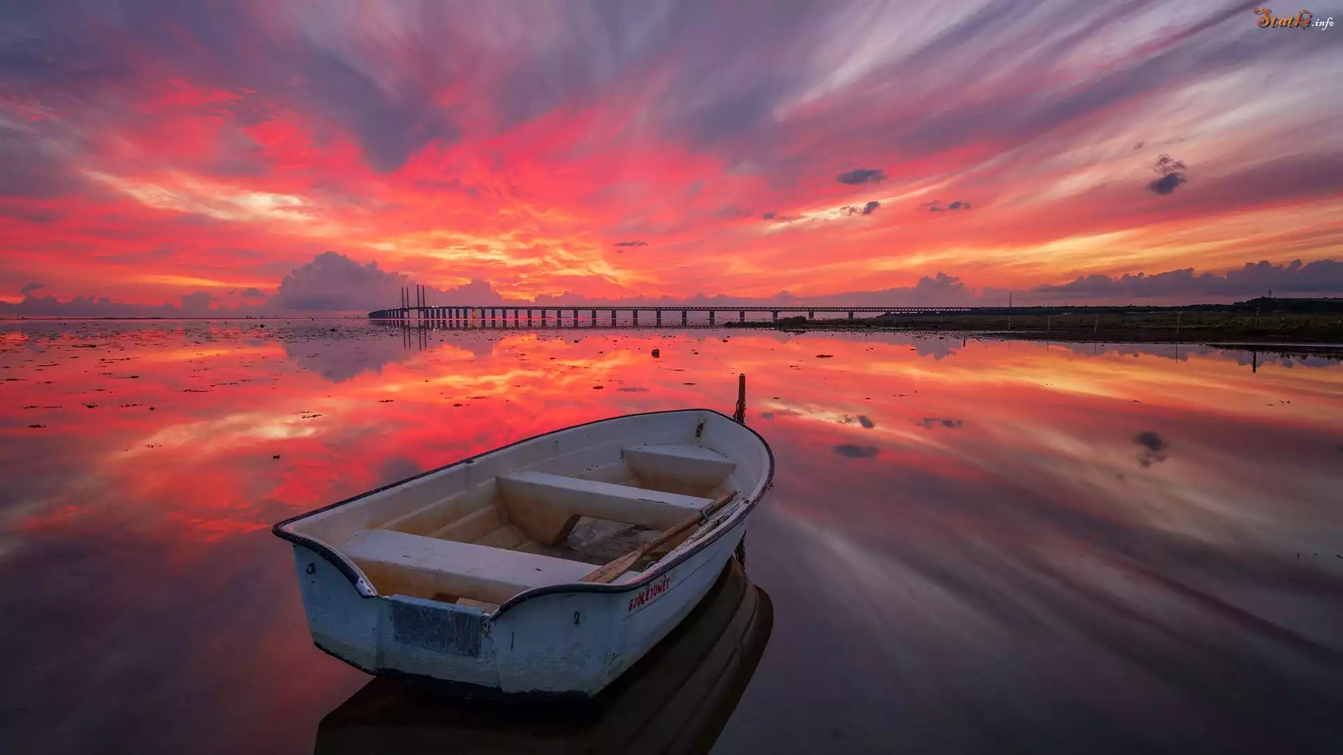 Jezioro, Most, Łódka, Zachód słońca, Chmury