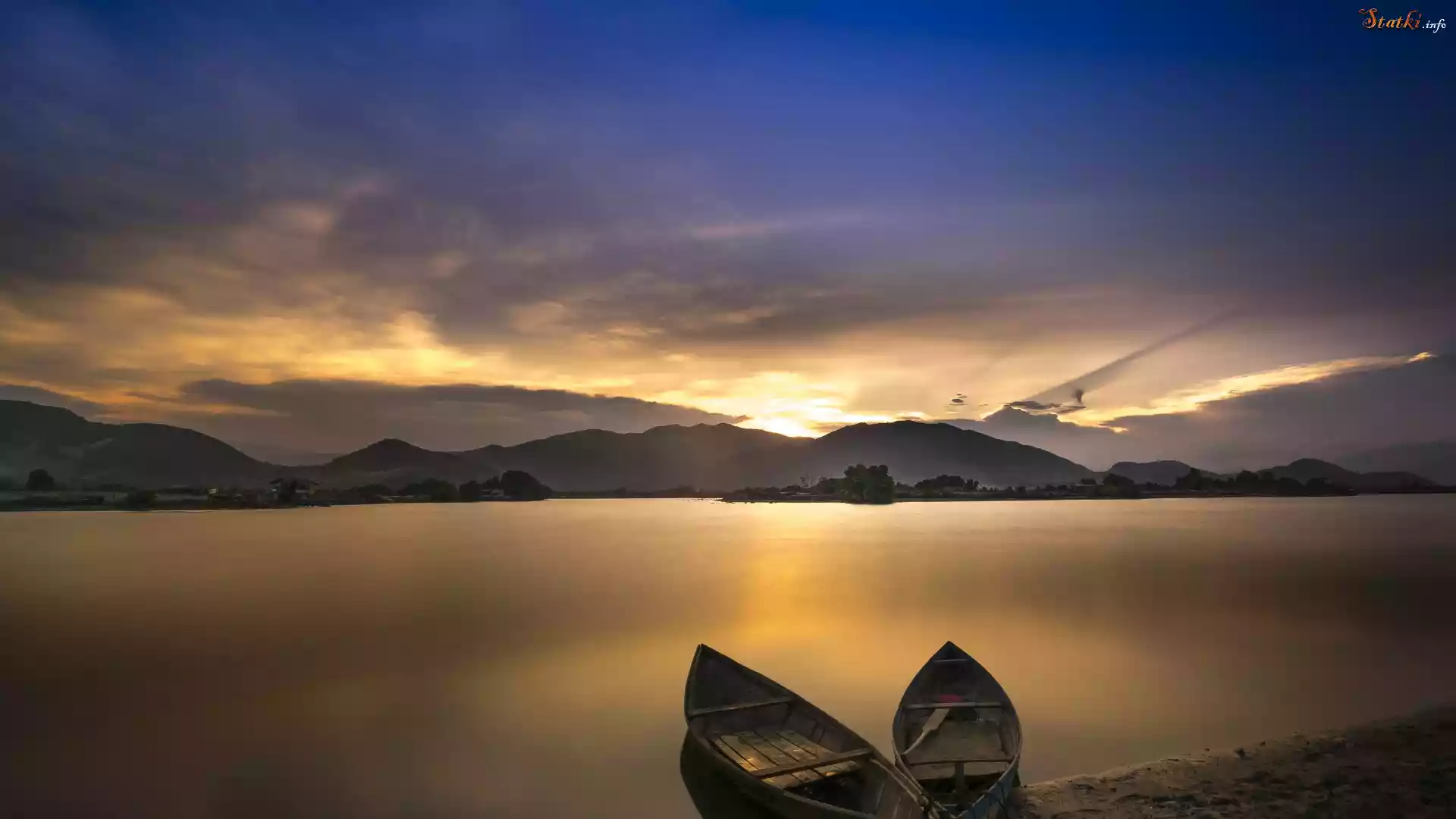 Statek Jezioro, Góry, Łódki, Zachód słońca, Góry