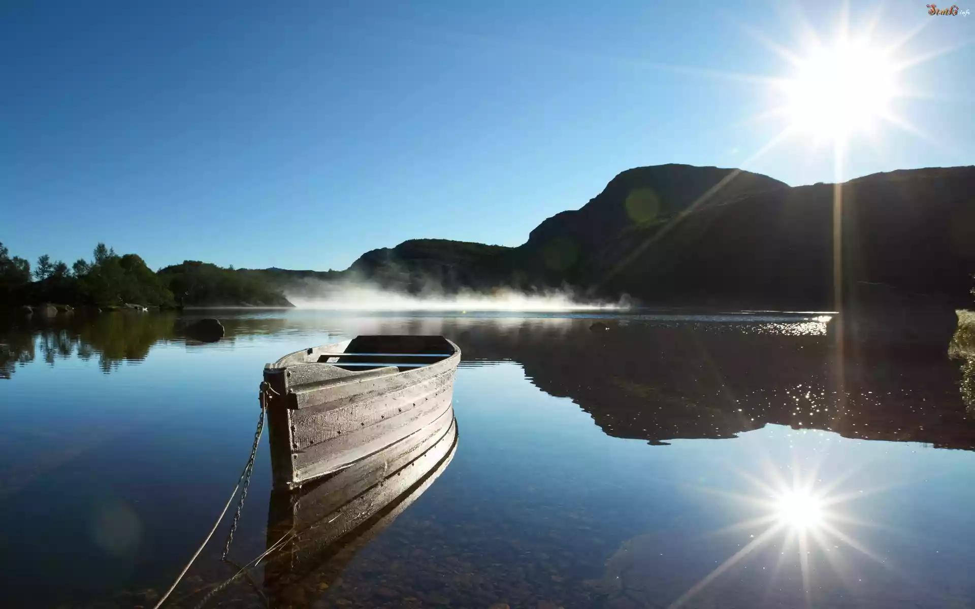 Statek Jezioro, Łódka, Promienie słońca, Wzgórza