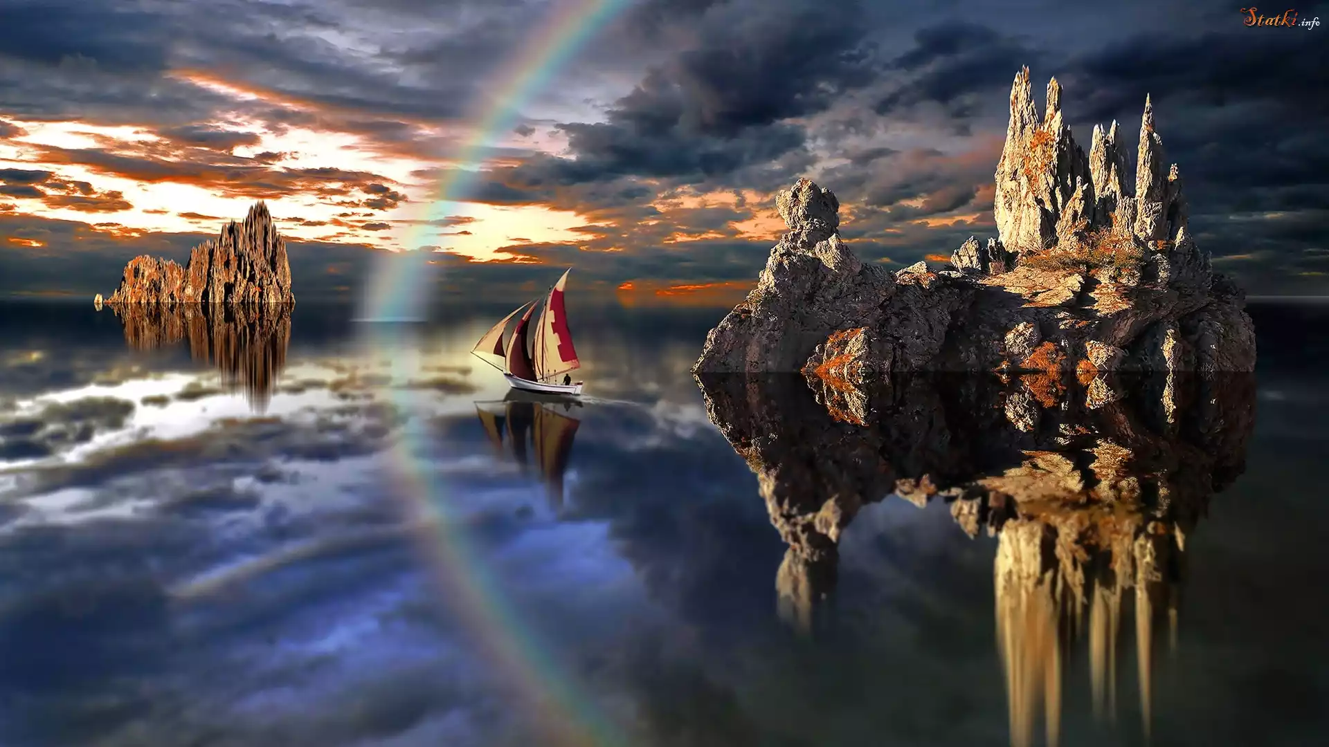 Statek Jezioro, Skały, Tęcza, Żaglówka