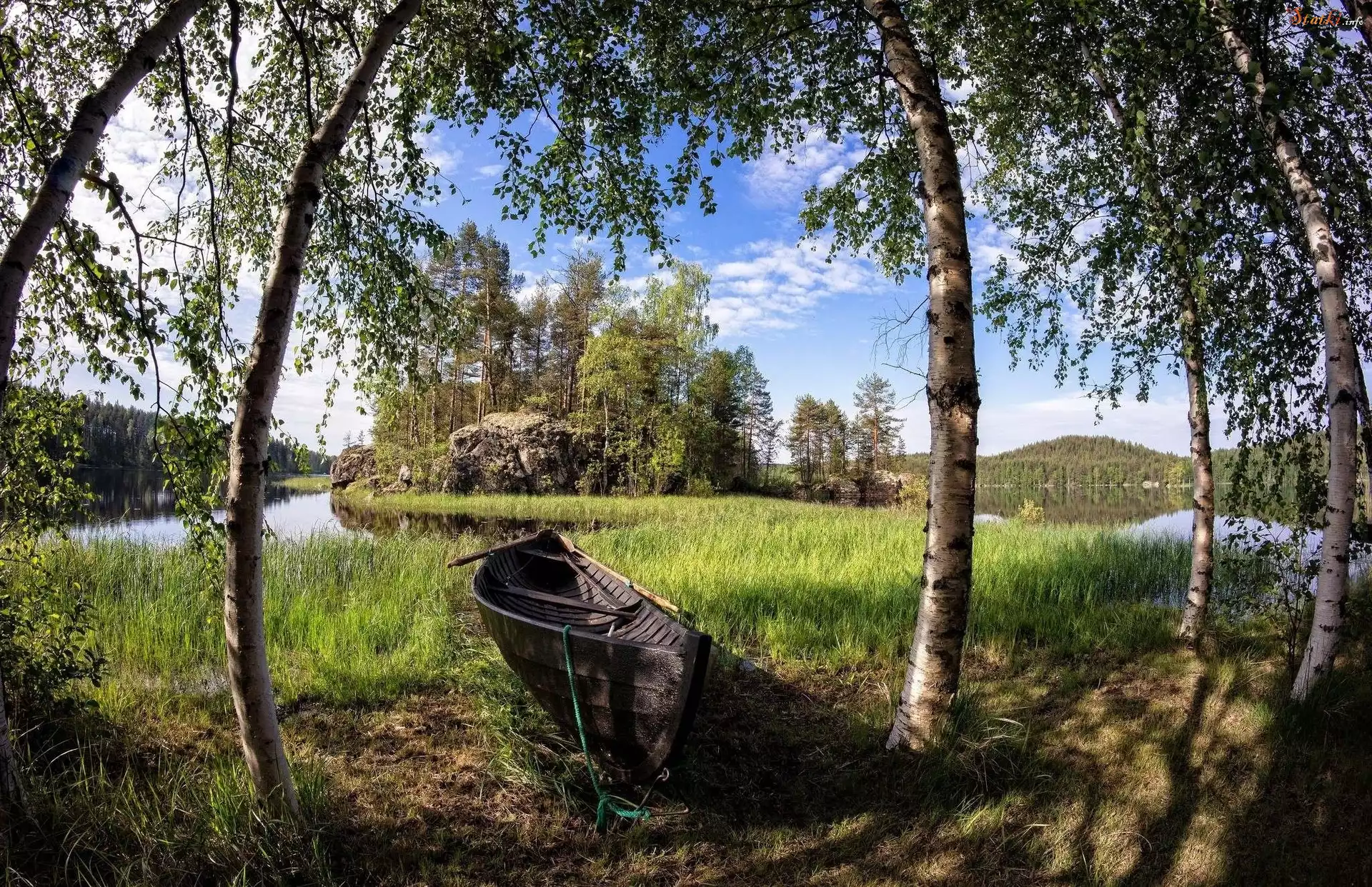 Statek Jezioro, Drzewa, Trawy, Łódka
