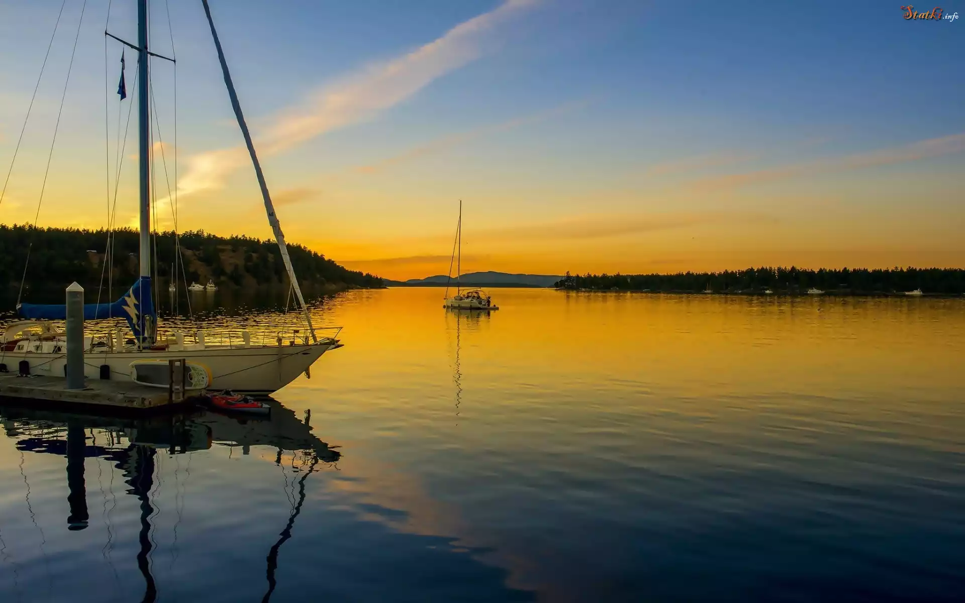Statek Jezioro, Żaglówki, Lasy, Zachód słońca