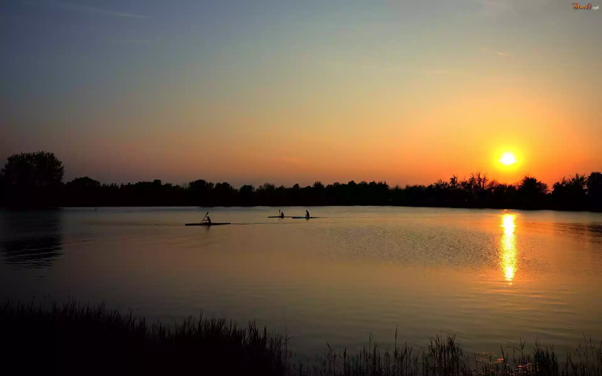 Jezioro, Ludzie, Kajaki, Las, Zachód, Słońca