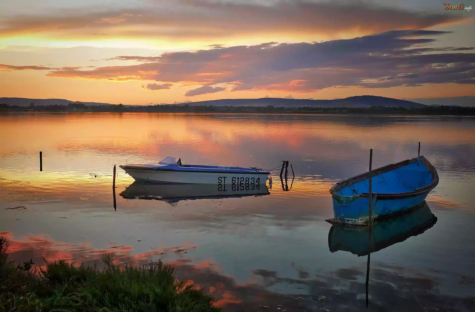 Jezioro, Dwie, Łódki, Jezioro, Zachód słońca