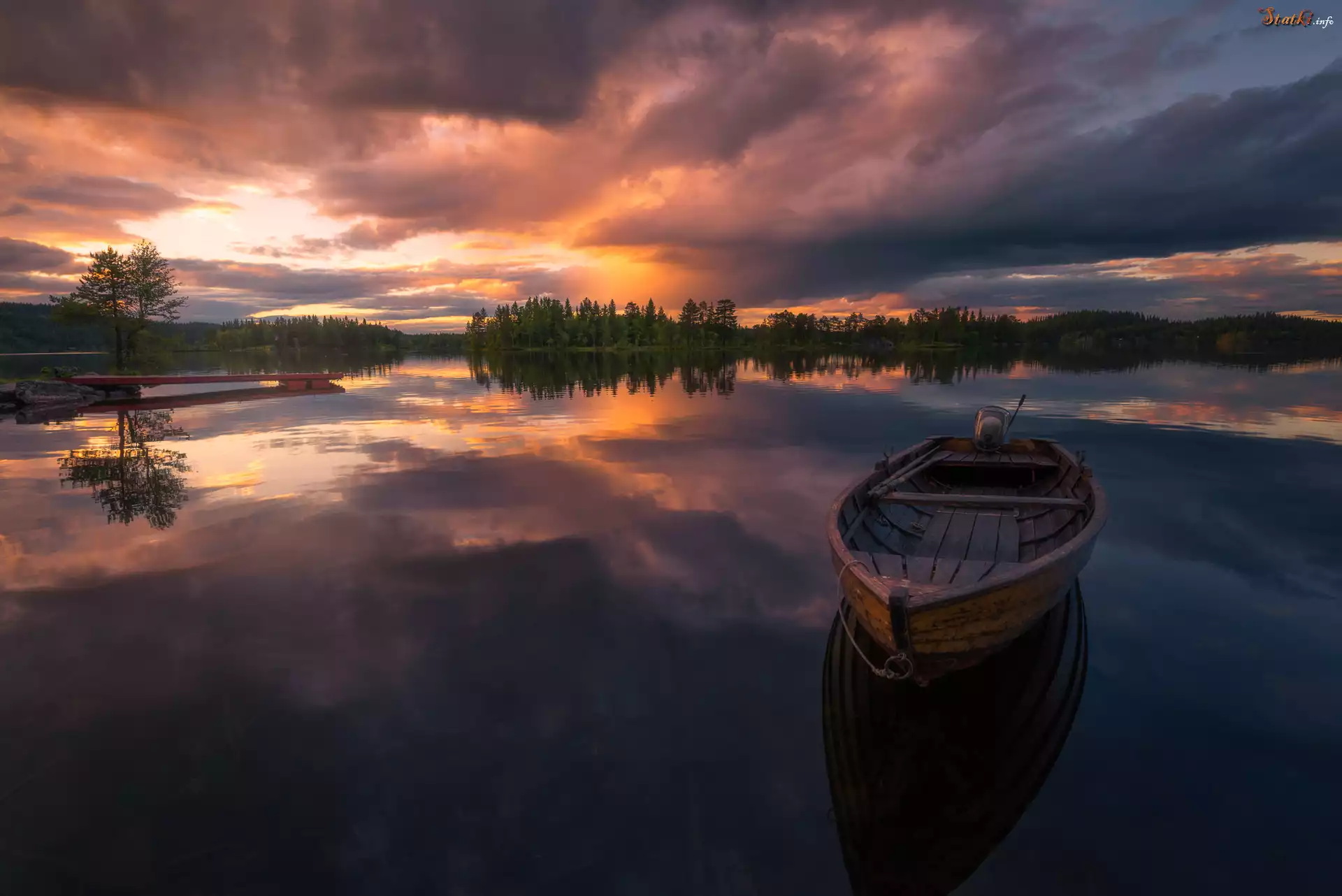 Jezioro, Łódka, Pomost, Drzewa, Zachód słońca