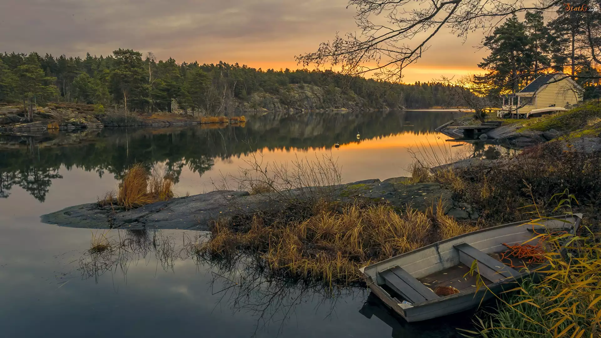 Statek Jezioro, Łódka, Trawa, Drzewa, Zachód słońca