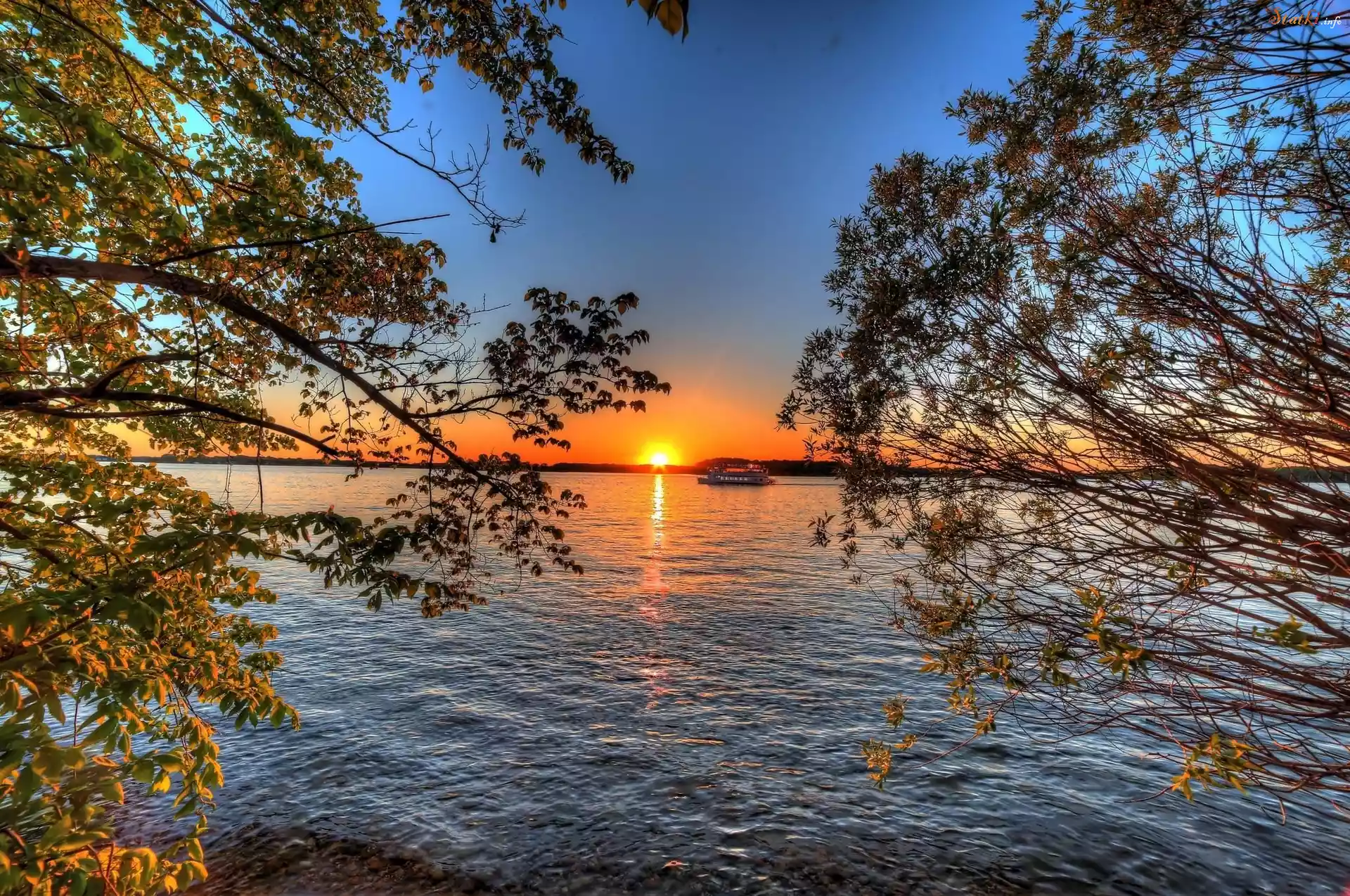 Jezioro, Statek, Wycieczkowy, Drzewa, Zachód, Słońca