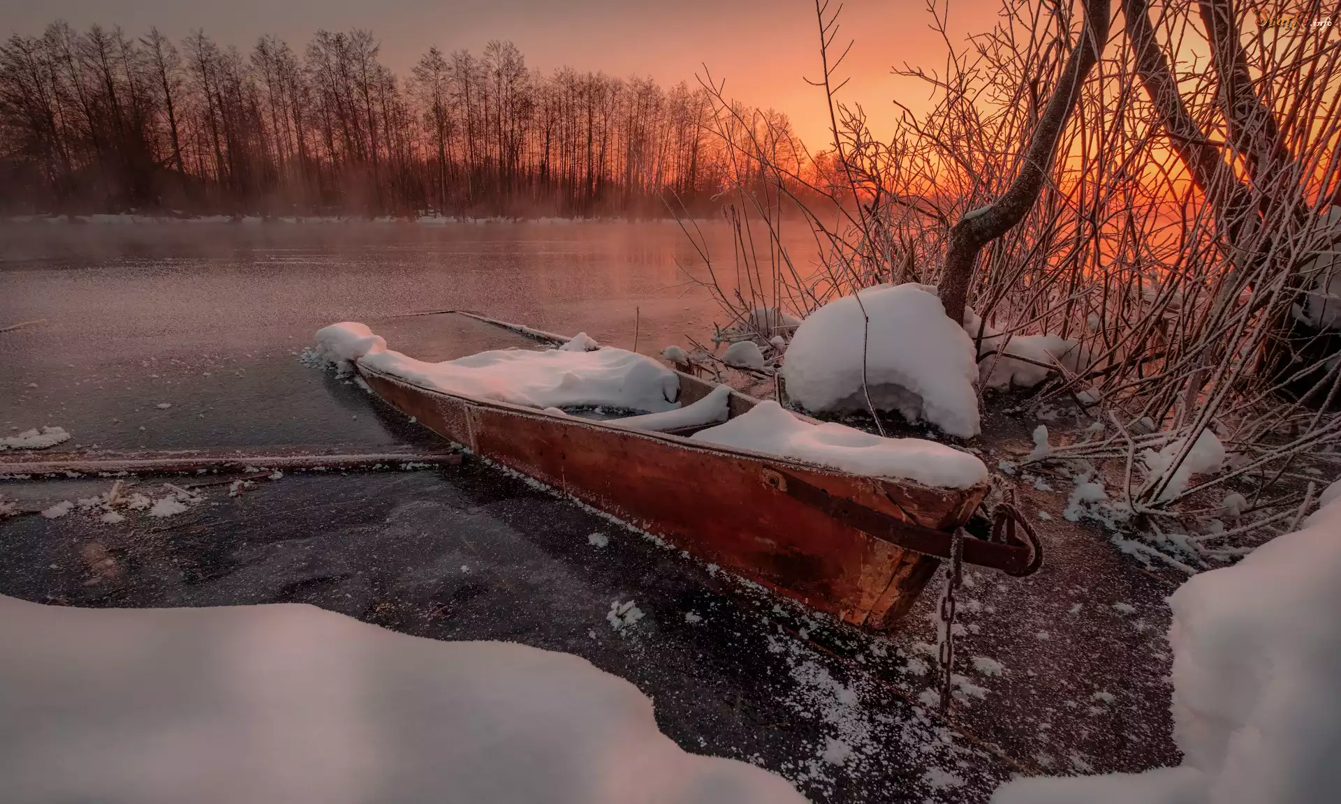 Statek Zima, Jezioro, Drzewa, Łódka, Śnieg, Zachód słońca