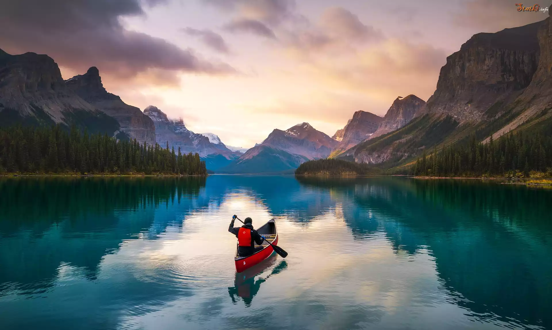 Park Narodowy Jasper, Jezioro, Maligne Lake, Czerwony, Kajak, Góry, Drzewa, Lasy, Chmury, Odbicie, Alberta, Kanada |