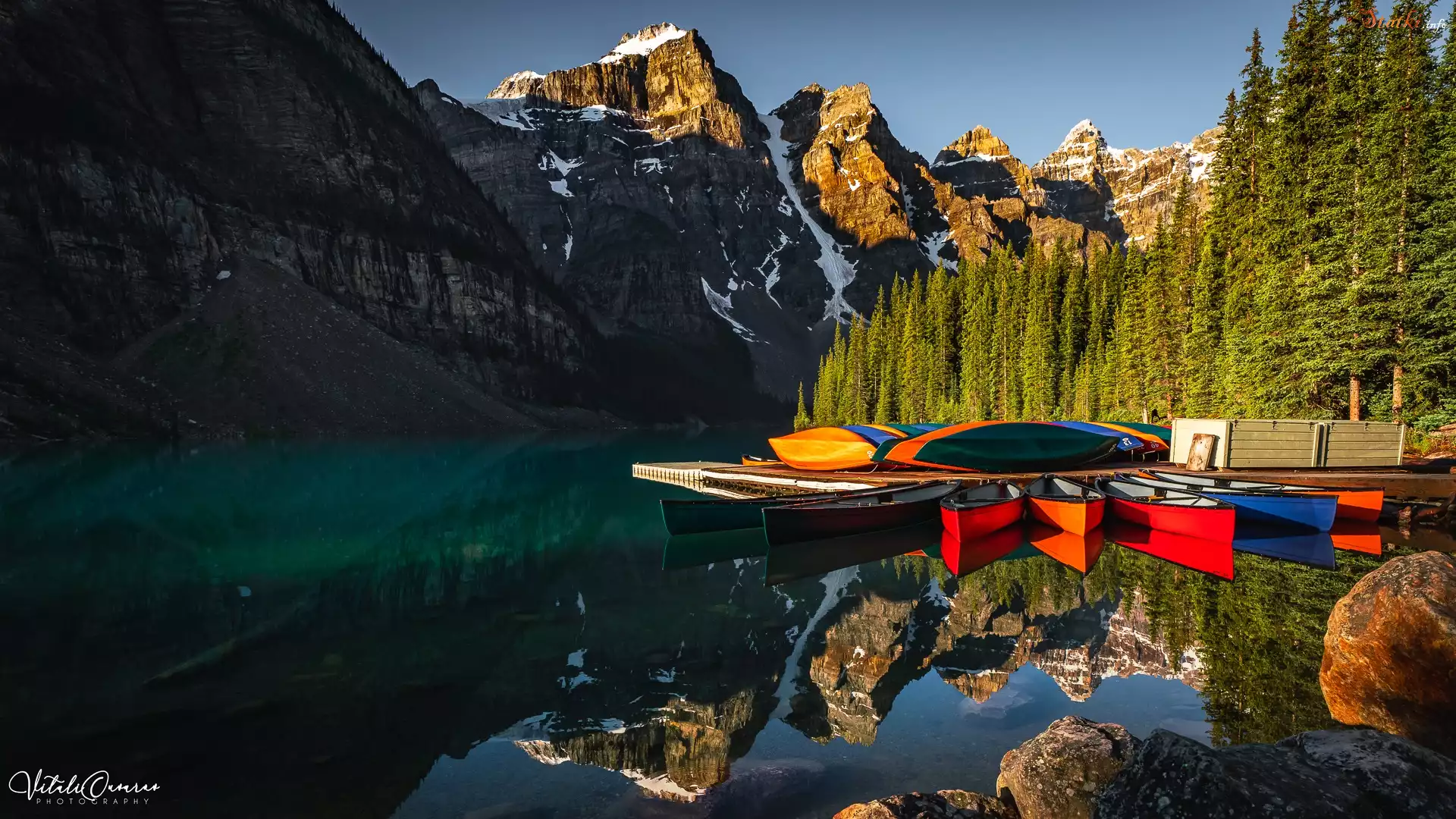 Jezioro, Moraine Lake, Pomost, Kajaki, Las, Drzewa, Góry, Park Narodowy Banff, Prowincja Alberta, Kanada |