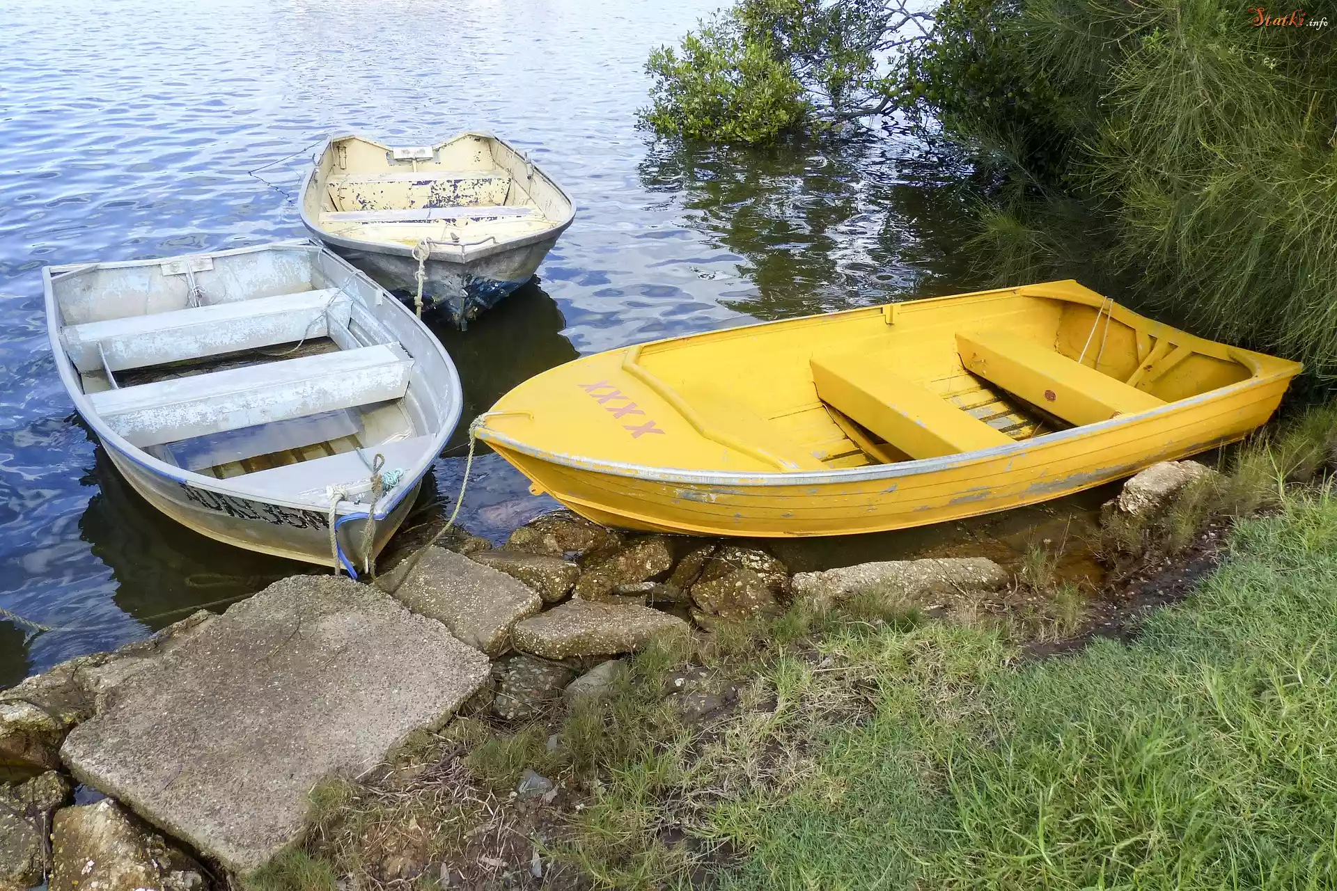 Łódki, Woda, Brzeg, Kamienie, Trawa