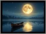Statek Noc, Księżyc, Łódka, Jezioro, AI