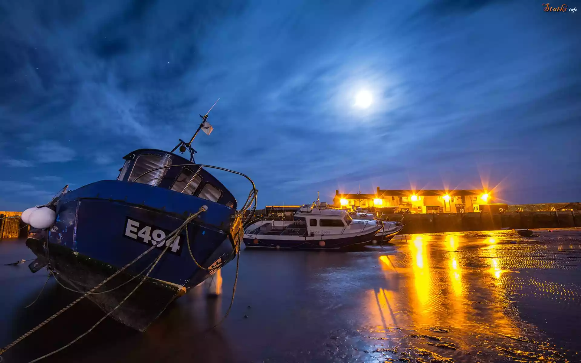 Noc, Księżyc, Morze, Przystań, Światła, Łódź, Motorówki