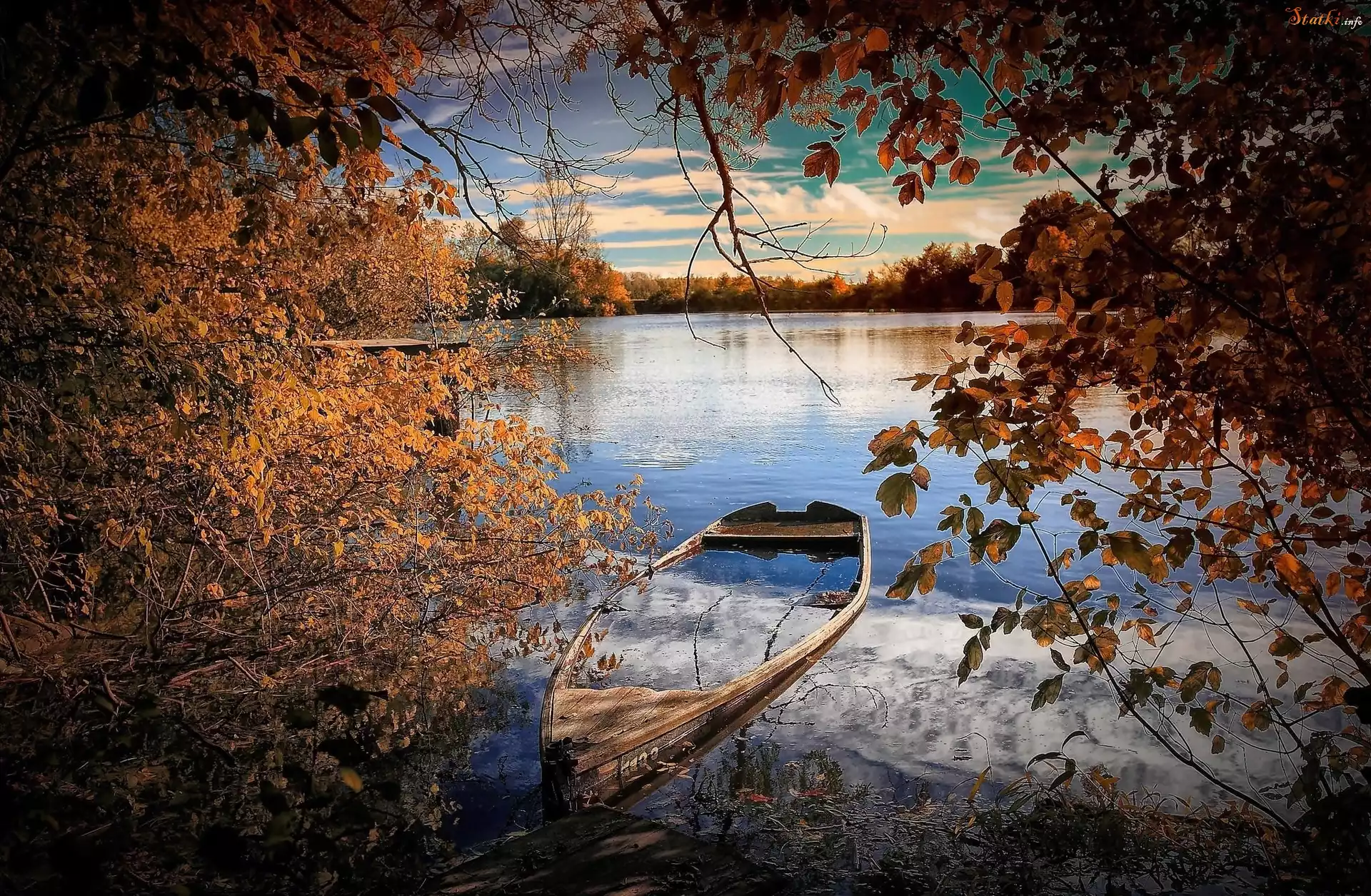 Łódka, Jezioro, Drzewa, Lasy, Jesień
