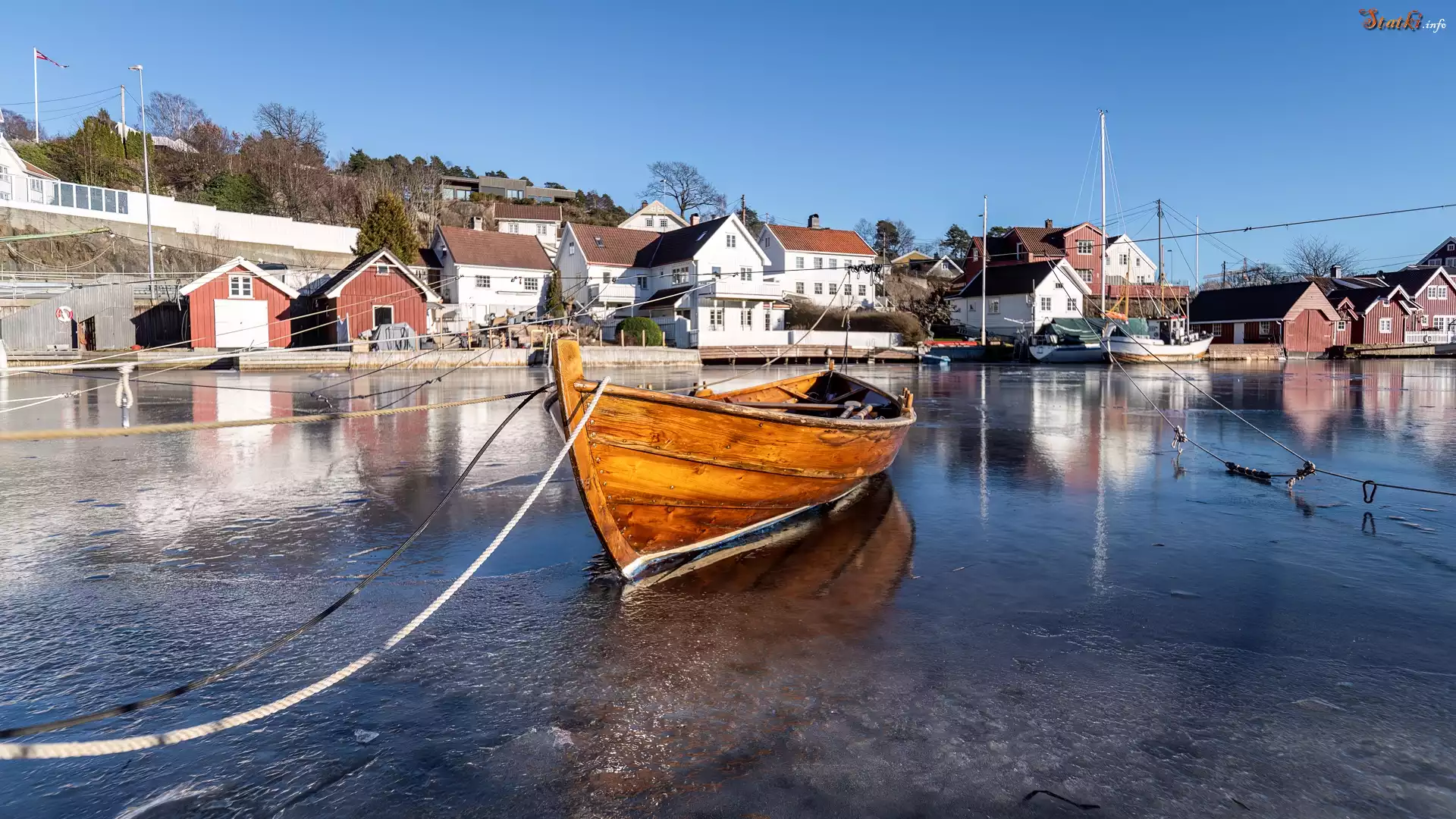 Domy, Łódka, Jezioro, Lód