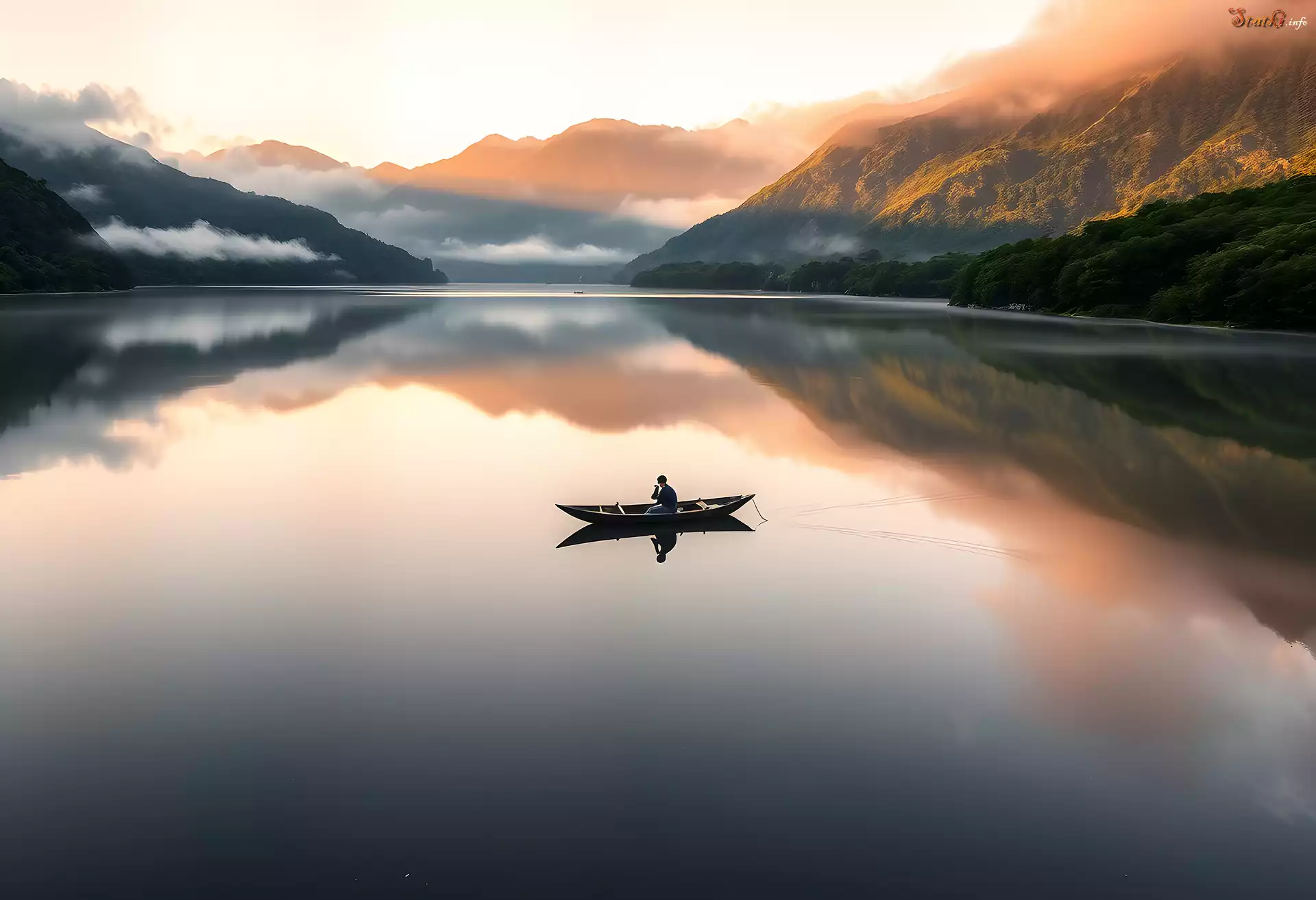Krajobraz, Przyroda, Natura, Góry, Mgła, Jezioro, Łódka, Człowiek, Rybak, Grafika, Komputerowa