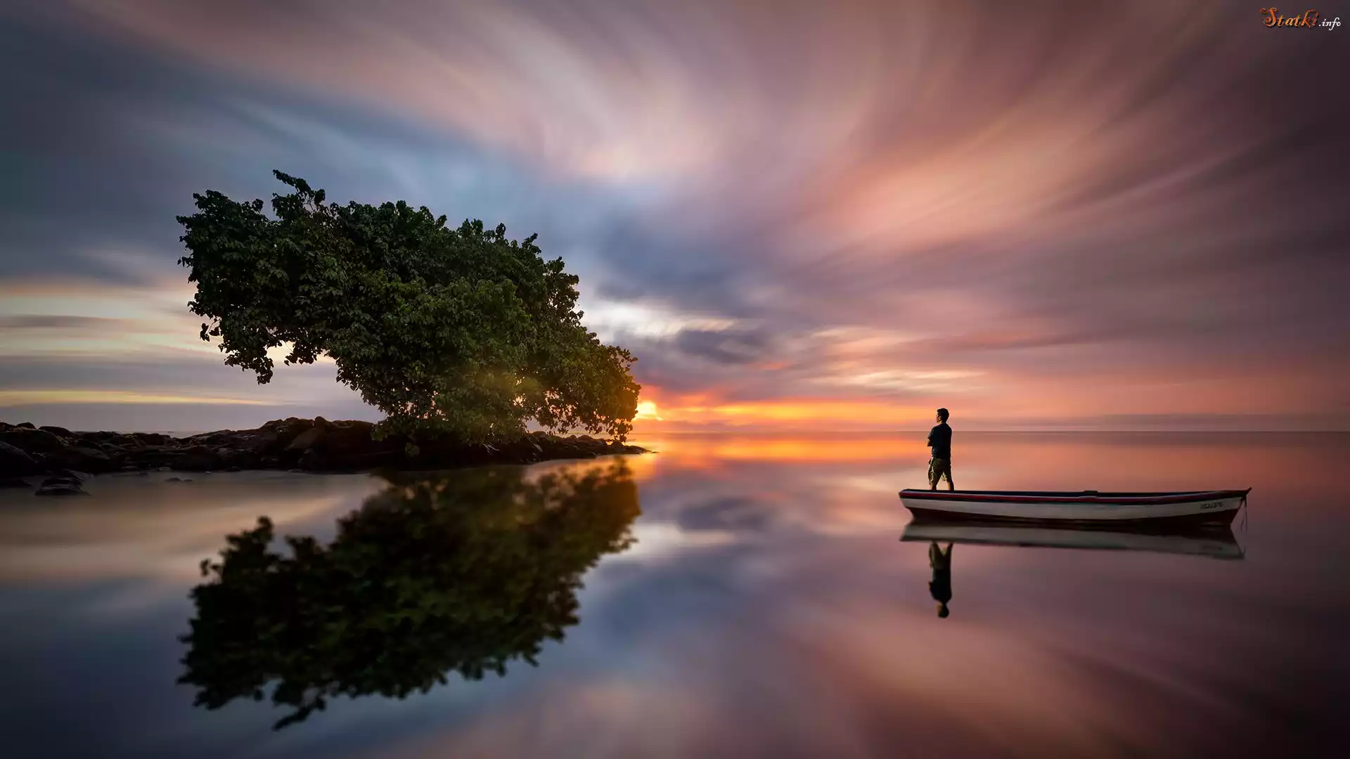 Statek Zachód słońca, Jezioro, Łódka, Mężczyzna, Drzewo