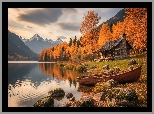 Jesień, Jezioro, Kamienie, Łódka, Dom, Drzewa, Góry