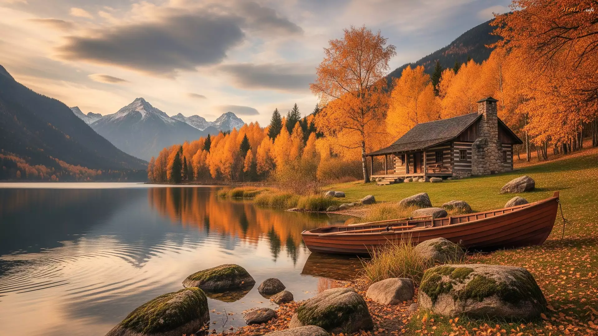 Statek Jesień, Jezioro, Kamienie, Łódka, Dom, Drzewa, Góry