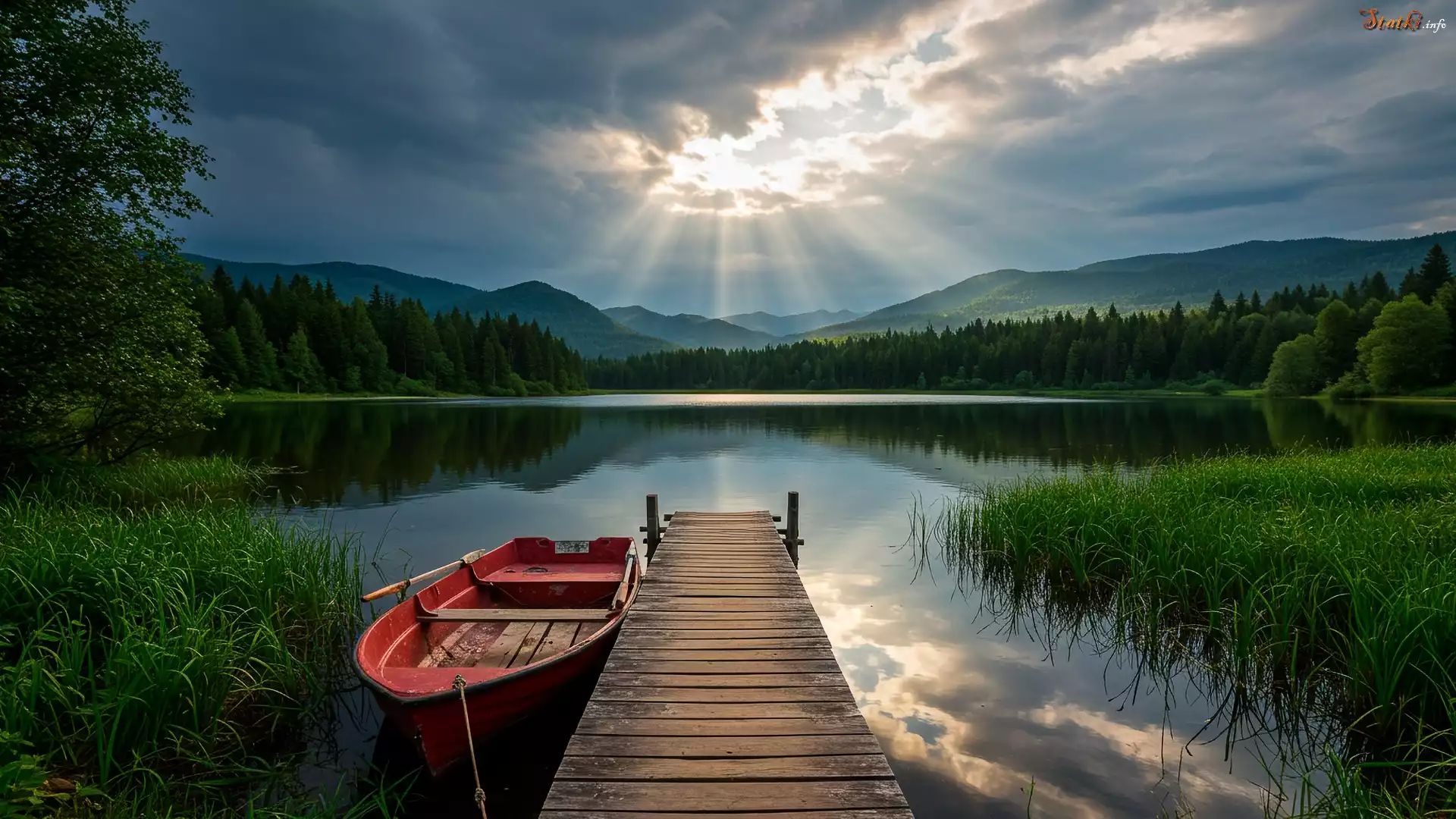 Statek Jezioro, Łódka, Pomost, Chmury, Las
