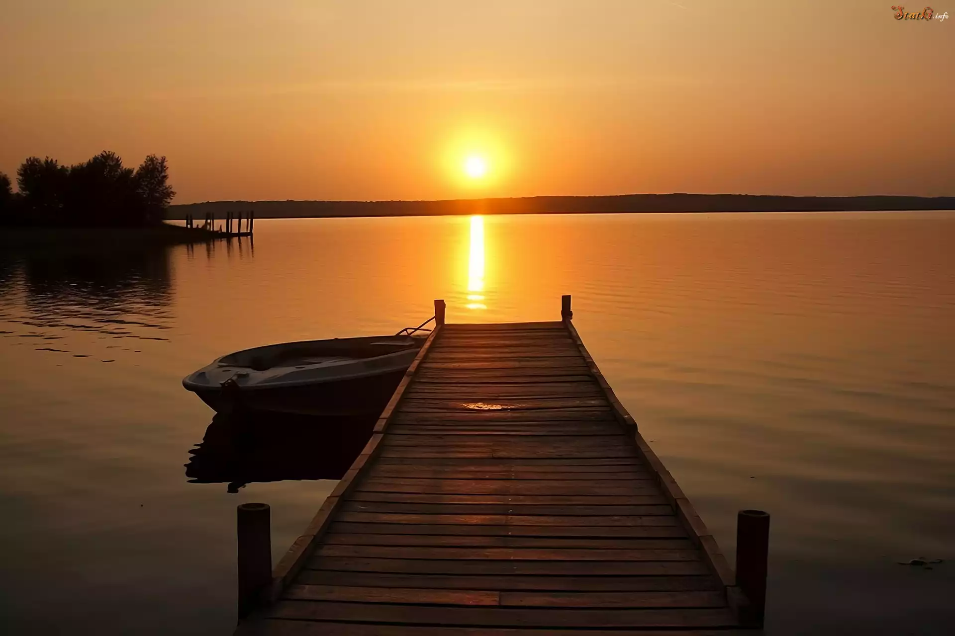 Statek Jezioro, Łódka, Pomost, Zachód słońca