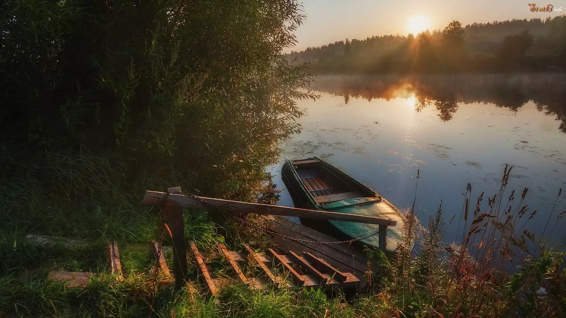 Promienie słońca, Rzeka, Łódka, Pomost, Drzewa, Rośliny