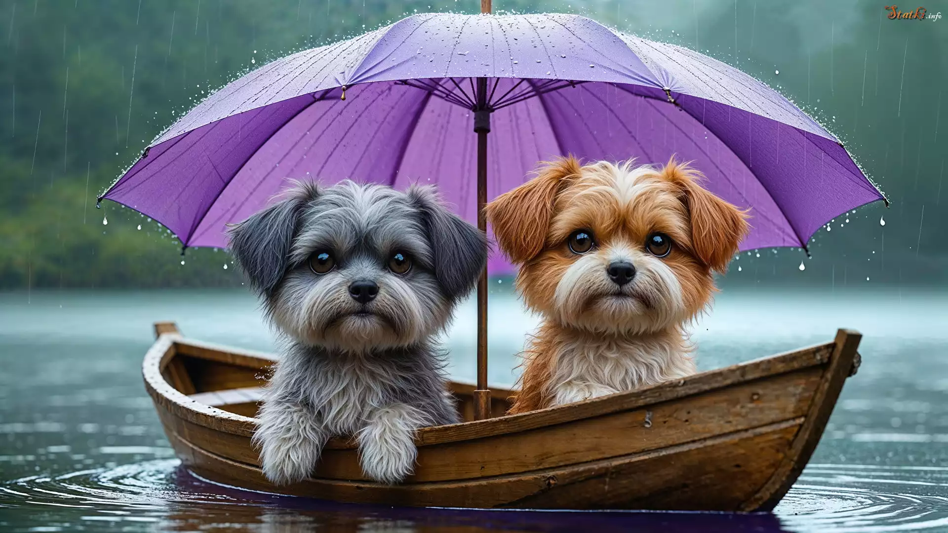 Statek Dwa, Psy, Szczeniaki, Łódka, Deszcz, Parasolka, Grafika