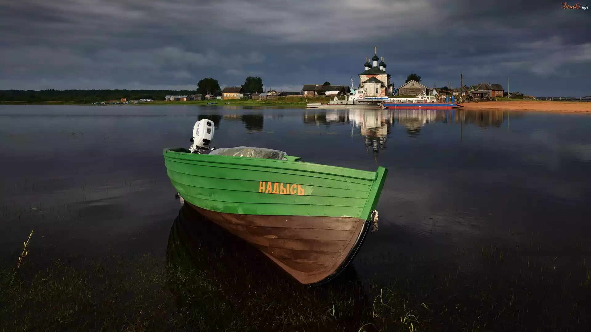 Statek Rzeka, Łódź, Cerkiew, Drzewa, Chmury